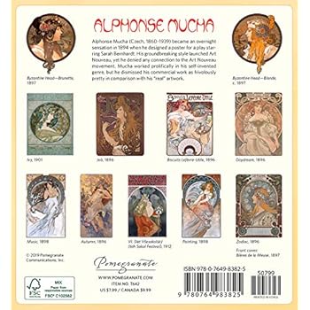 Alphonse Mucha (Czech, 1860 1939) became an overnight sensation in 1894 when he designed a poster for a play starring Sarah Bernhardt. His groundbreaking style launched Art Nouveau, yet he denied any connection to the Art Nouveau movement. Mucha worked prolifically in his self-invented genre, but he dismissed his commercial work as frivolously pretty in comparison with his real artwork. All of Pomegranate s calendars are printed with soy-based inks on FSC® certified paper, which means the paper has been certified by the Forest Stewardship Council® and manufactured by an FSC certified printer. FSC certification promotes responsible forest management by ensuring that forestry practices are environmentally responsible, socially equitable, and economically viable. FSC license code FSC N001864.